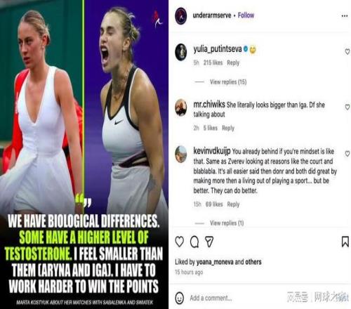 这场决赛前,科斯秋克经历了一段不平静的时期。去年十月底,她在一场访谈中谈及萨巴伦卡与斯瓦泰克时,被媒体断章取义地报道为“用睾固酮水平较高来解释她们的身体差异”,引发了不小的争议。