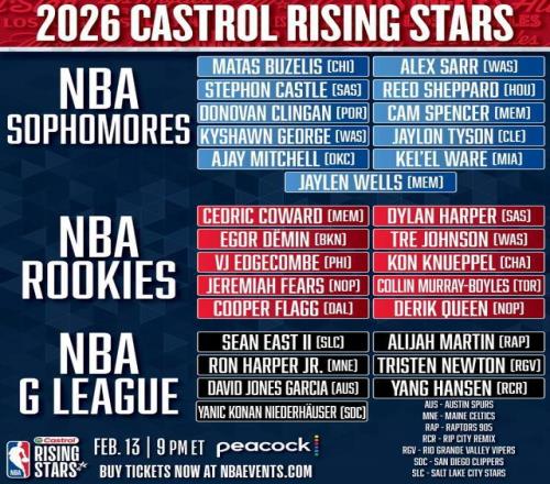 NBA官方公布了今年全明星新秀赛的完整名单,其中一年级新秀和二年级新秀一共21人入选,其中新科状元弗拉格领衔新秀名单,二年级则由去年榜眼萨尔领衔,状元里萨谢则落选。此外,发展联盟还有7人入选,其中杨瀚森代表撕裂之城混音入选。今年的全明星新秀赛还是延续此前的赛制,21名NBA一二年级新秀,分成三支球队,7名G联赛代表组成一支球队,进行锦标赛对决。